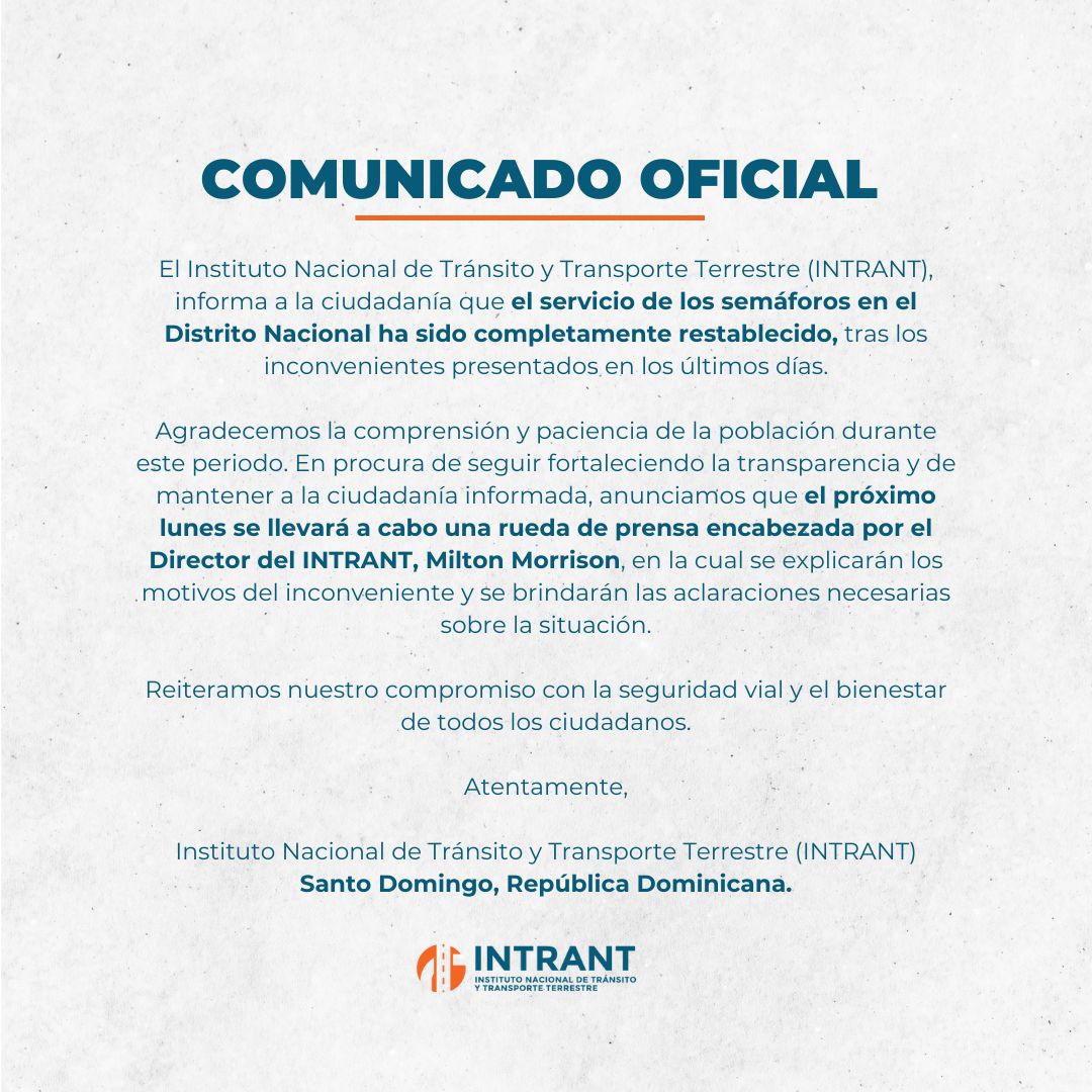 SANTO DOMINGO -.– SANTO DOMINGO. - El Instituto Nacional de Tránsito y Transporte Terrestre (INTRANT) informó que el servicio de los semáforos en el Distrito Nacional ha sido completamente restablecido, tras el caos vehicular del día de ayer.
