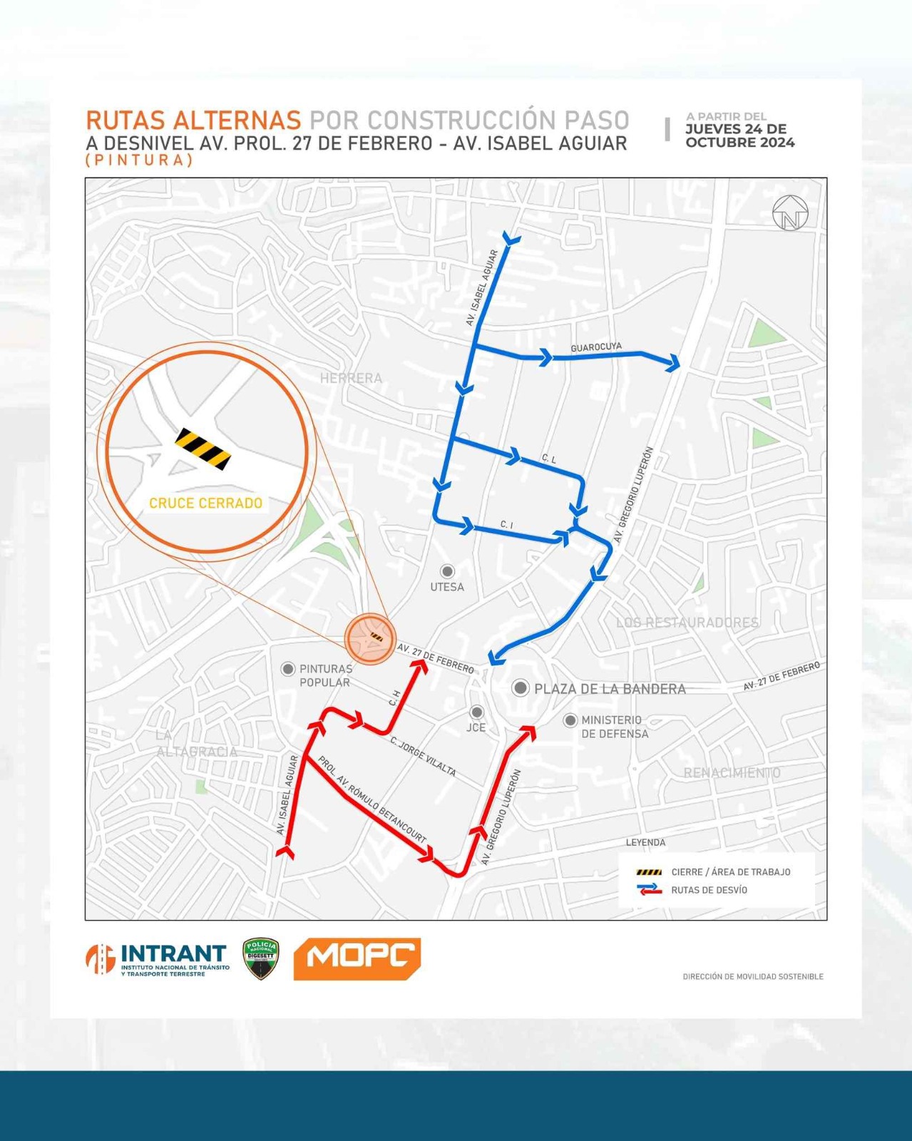 Santo Domingo.– SANTO DOMINGO.- A partir de este jueves, queda restringido el paso de vehículos en la Av. Isabel Aguiar con Av. Prol. 27 de Febrero (Pintura) en ambos lados, debido a los avances en las obras de infraestructura que realiza el Ministerio de Obras Públicas y Comunicaciones (MOPC).