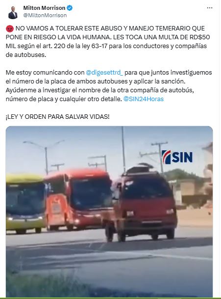 "No vamos a tolerar este abuso y manejo temerario que pone en riesgo la vida humana. Les toca una multa de RD$50 MIL según el art. 220 de la ley 63-17 para los conductores y compañías de autobuses", escribió Morrison en su cuenta X (antes Twitter).
