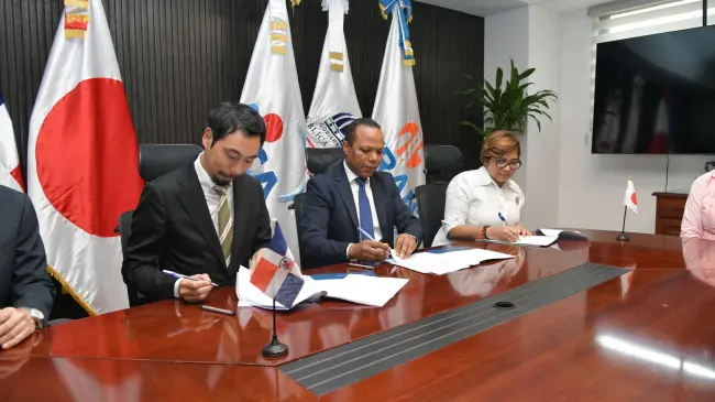 La firma fue rubricada en la sede del Intrant entre el representante de la JICA, Sakaguchi Kota, y el nuevo director de Intrant, Milton Morrison, con la presencia del Ministerio de Economía, Planificación y Desarrollo como testigo firmante, en la persona de la viceministra Olaya Dotel; y del embajador de Japón en la República Dominicana, Takagi Masahiro.