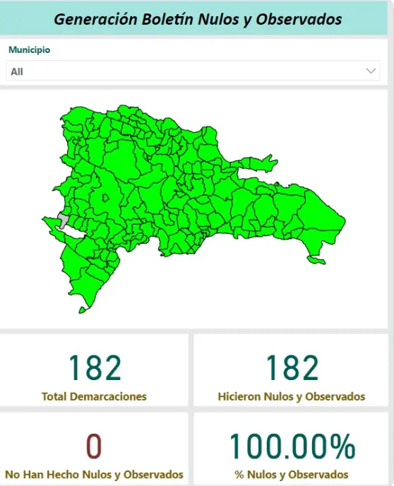 De acuerdo a lo señalado, un total de 182 demarcaciones fueron se produjeron el mismo número votos nulos y observados. Además, fueron observados en un 100.00%.