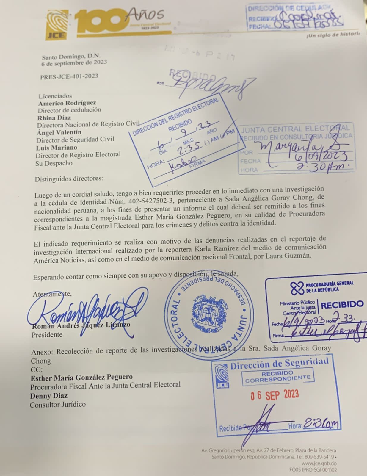 El presidente de la Junta, en una comunicación emitida a los directores de Cedulación, Registro Civil, Seguridad Civil y Registro Electoral, les hizo solicitud de un informe acerca de la emisión del documento de identidad de la extranjera. Este deberá ser presentado ante Esther María González Peguero, procuradora fiscal ante la JCE para crímenes y delitos contra la identidad.