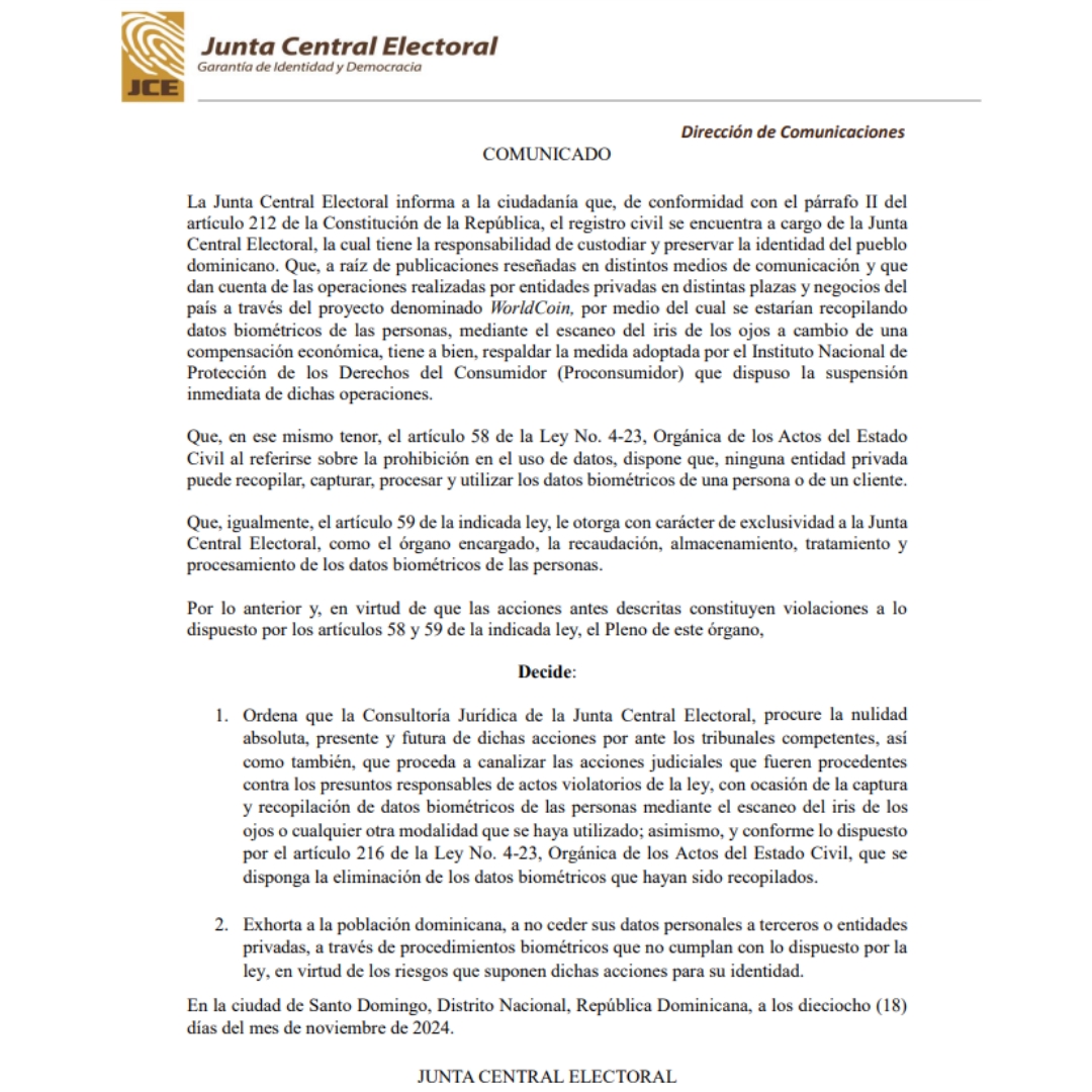 En un comunicado, el órgano electoral señaló que, de acuerdo a la Ley No. 4-23, Orgánica de los Actos del Estado Civil, la recolección, procesamiento y uso de datos biométricos está exclusivamente a cargo de la JCE. Además, la ley prohíbe que entidades privadas capturen y utilicen dichos datos.