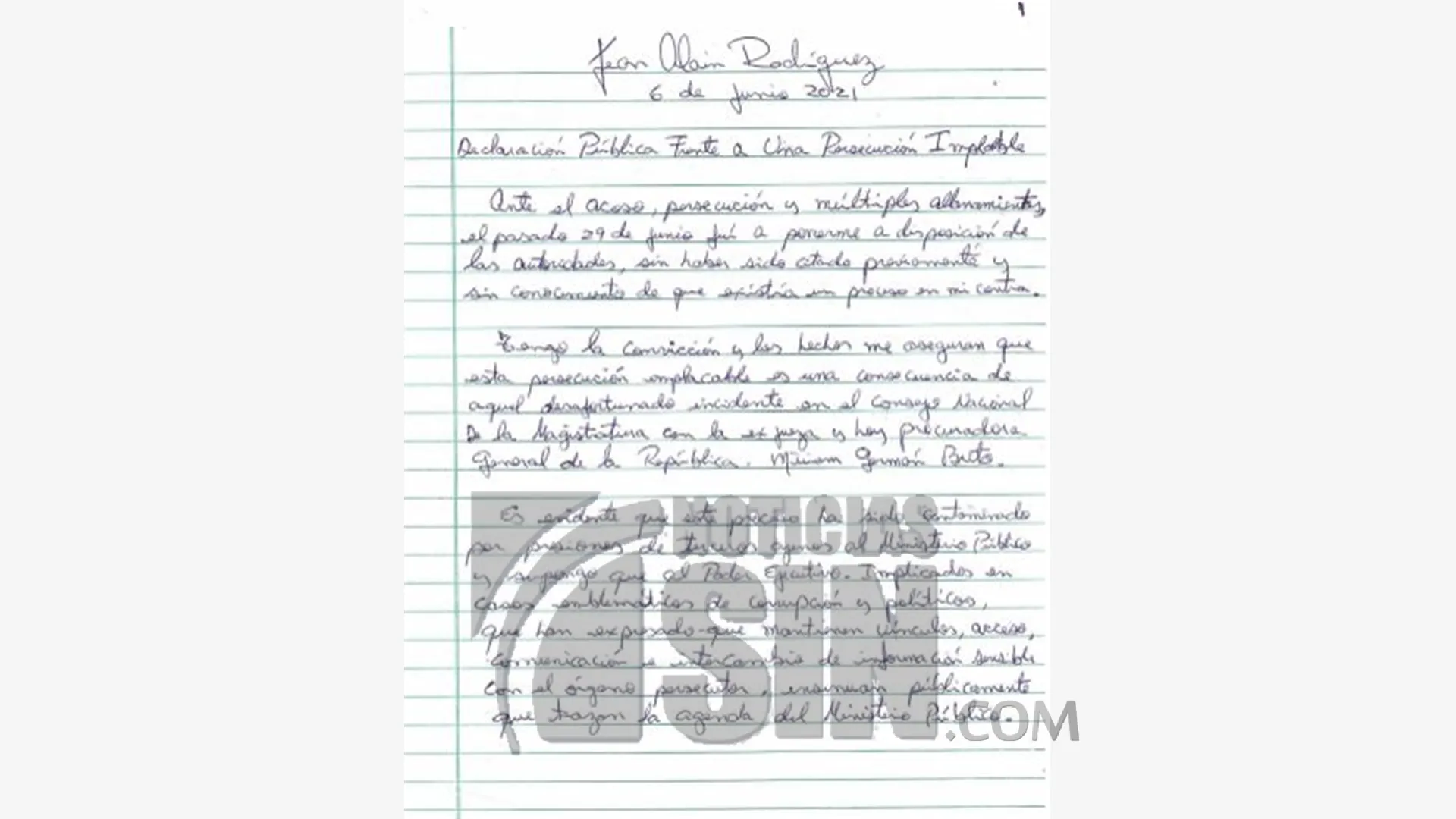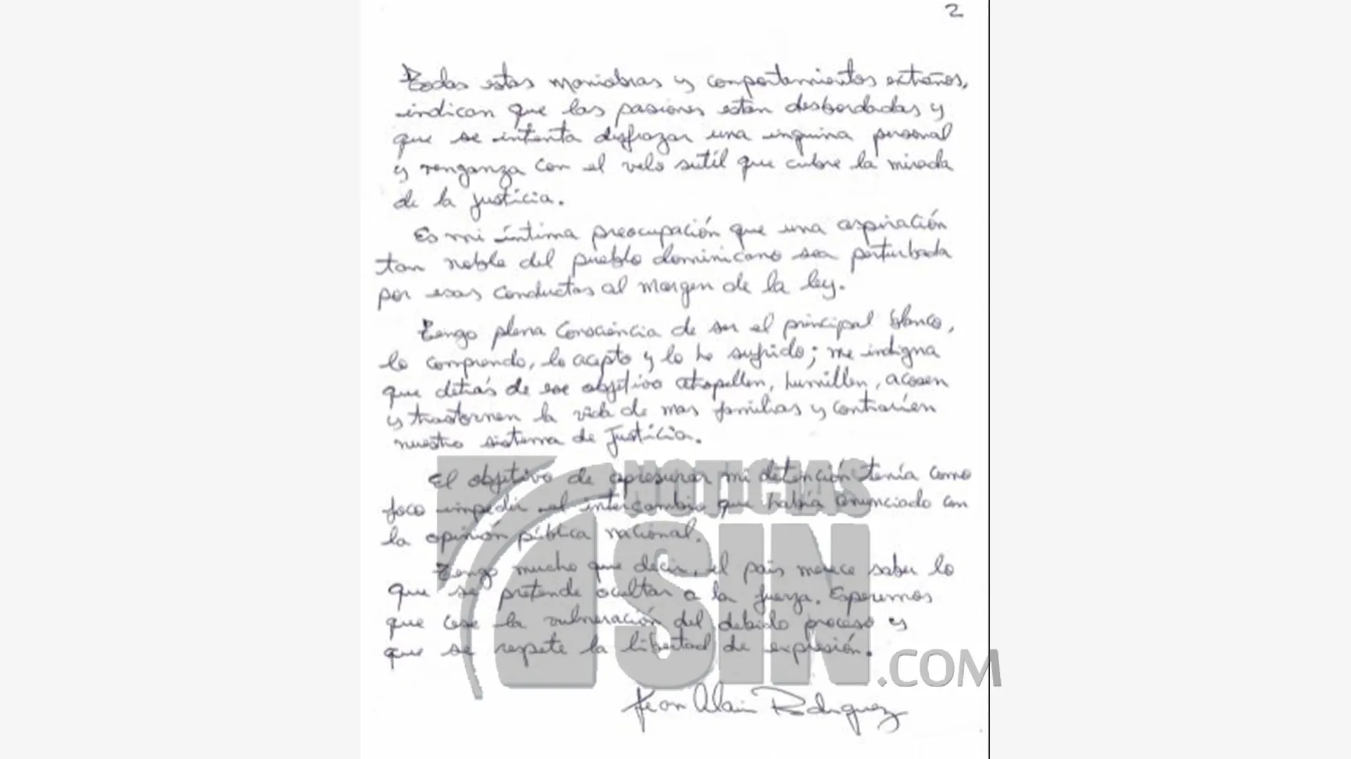 SANTO DOMINGO.- A menos de 12 de horas de que el ex procurador Jean Alain Rodríguez y los demás implicados en la Operación Medusa se presenten este jueves ante un tribunal de instrucción para conocer las medidas de coerción, el ex funcionario envío una carta a la periodista Alicia Ortega a través de sus abogados.