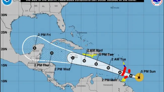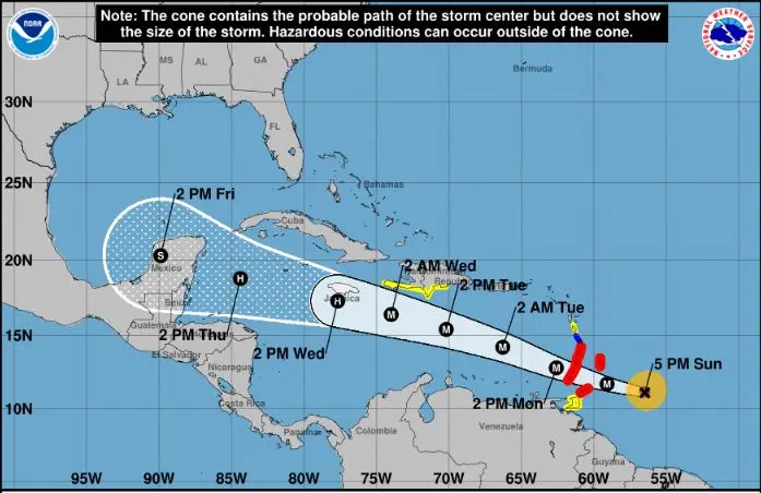 El informe indica que se espera un movimiento rápido continuo hacia el oeste a oeste-noroeste durante los próximos días. En la trayectoria del pronóstico, se espera que el centro de Beryl se mueva a través de las Islas de Barlovento el lunes por la mañana y a través del Mar Caribe sureste y el centro hasta el miércoles.
