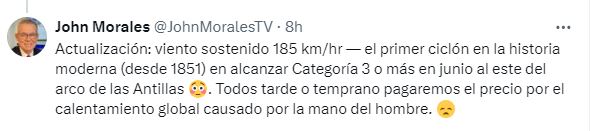“Beryl en proceso de rápida intensificación (¡en junio!), Con el paso del tiempo hay más certeza sobre su ruta, y ya todo Hispaniola quedó fuera del "cono" que traza hoy domingo el Centro Nacional de Huracanes. Pasaría a 335 km del GSD el martes”, indicó Morales; además, agregó que pueden caer 150 milímetros (mm) de lluvia.