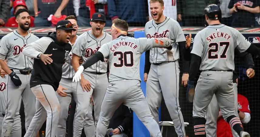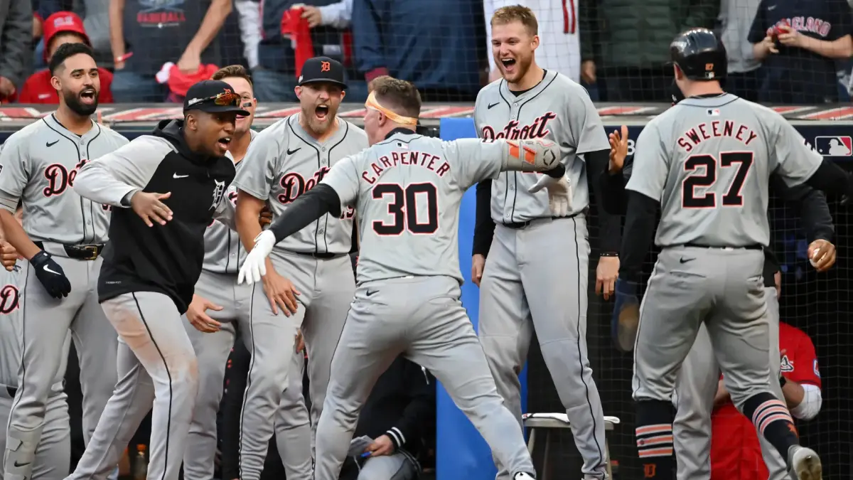 Jake Rogers bateó un sencillo con dos outs y Trey Sweeney prosiguió con otro sencillo. Carpenter, quien había ingresado al juego el inning como bateador emergente, demolió un pitcheo en cuenta de 2-2, depositando la pelota en las gradas del bosque derecho para dejar estupefactos a los fanáticos de Cleveland.