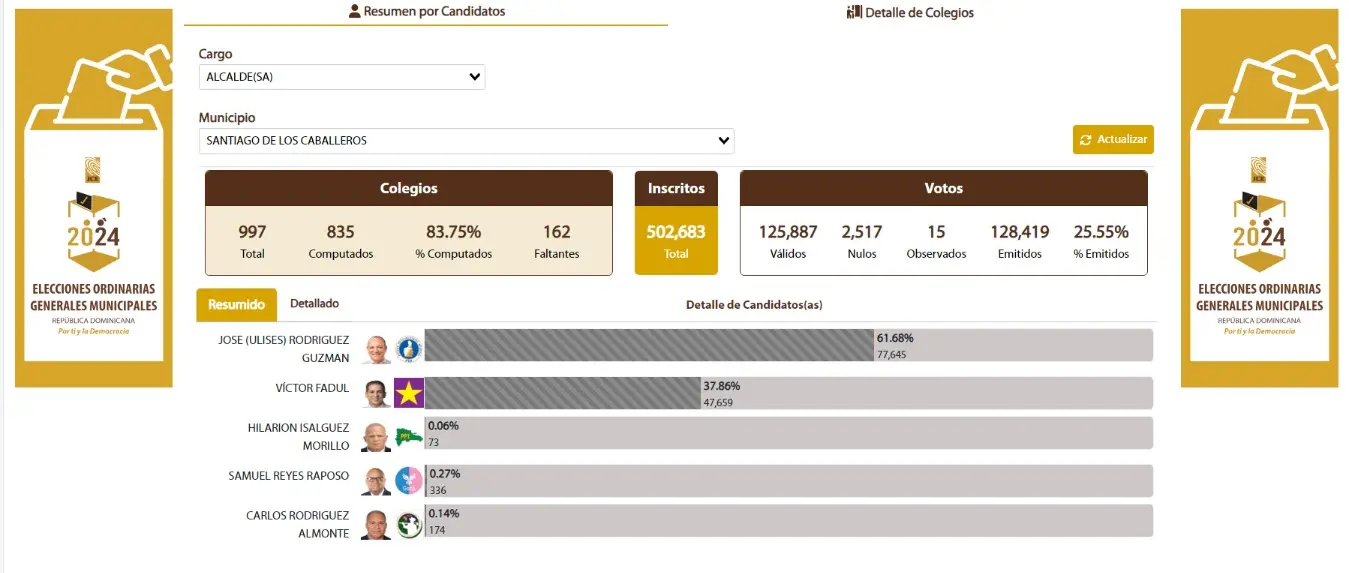 Santiago-.– SANTIAGO- José Ulises Rodríguez, candidato del Partido Revolucionario Moderno (PRM) en Santiago de los Caballeros encabeza las elecciones municipales con un porcentaje de 61.67 %.
