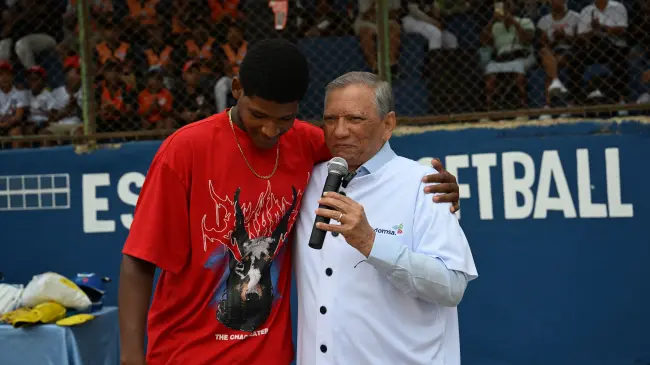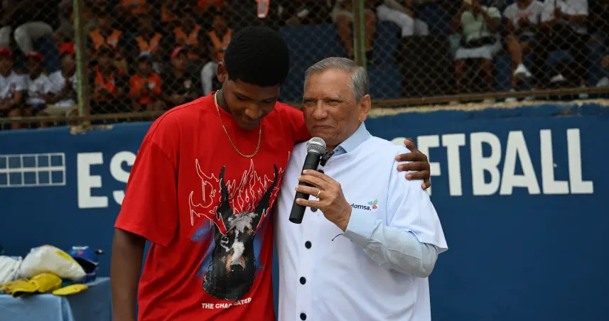 Abreu recibió de Refidomsa el equipamiento completo de un jugador de béisbol, desde las guantillas hasta el casco protector, utensilios que recibió de manos del doctor Aguilera, en medio de la ovación de los presentes en el estado de Gringo, en Haina.