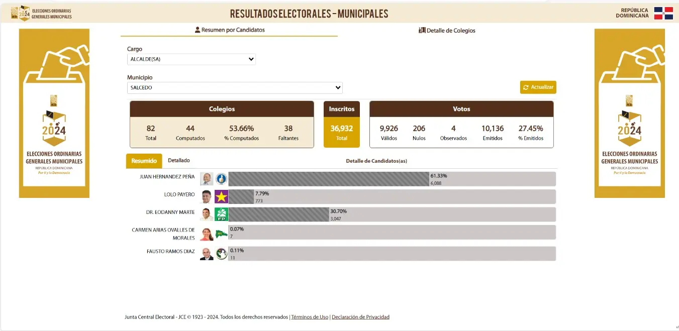 Según detalla la Junta Central Electoral en su primer boletín, Lolo Payero del Partido de la Liberación Dominicana, obtuvo un total de 6.92%, Eodanny Marte de la Fuerza del Pueblo, 30.66%, Carmen Arias Ovalles de Morales, 0.07% y Fausto Ramos Díaz, con un total de 0.07% de los votos.