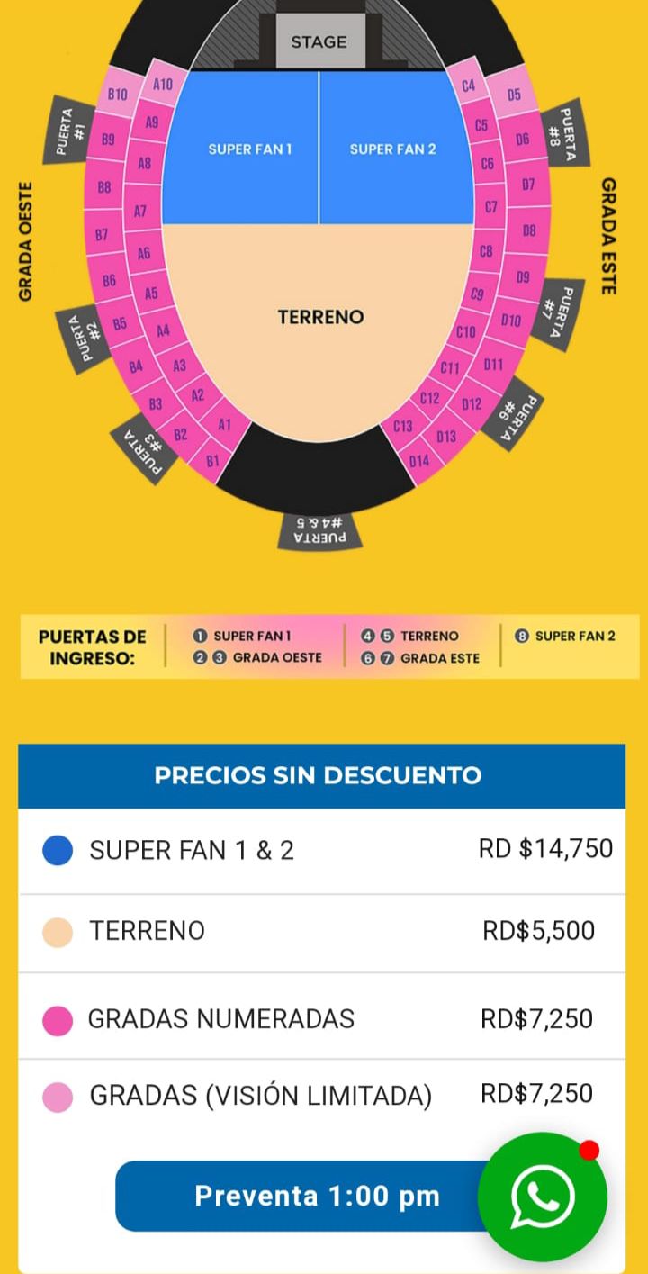 Los precios van desde RD$ 4.400 con descuento VISA Banreservas ya aplicado. Todas las boletas de gradas serán numeradas. Súper Fan y Terreno serán de Pie.