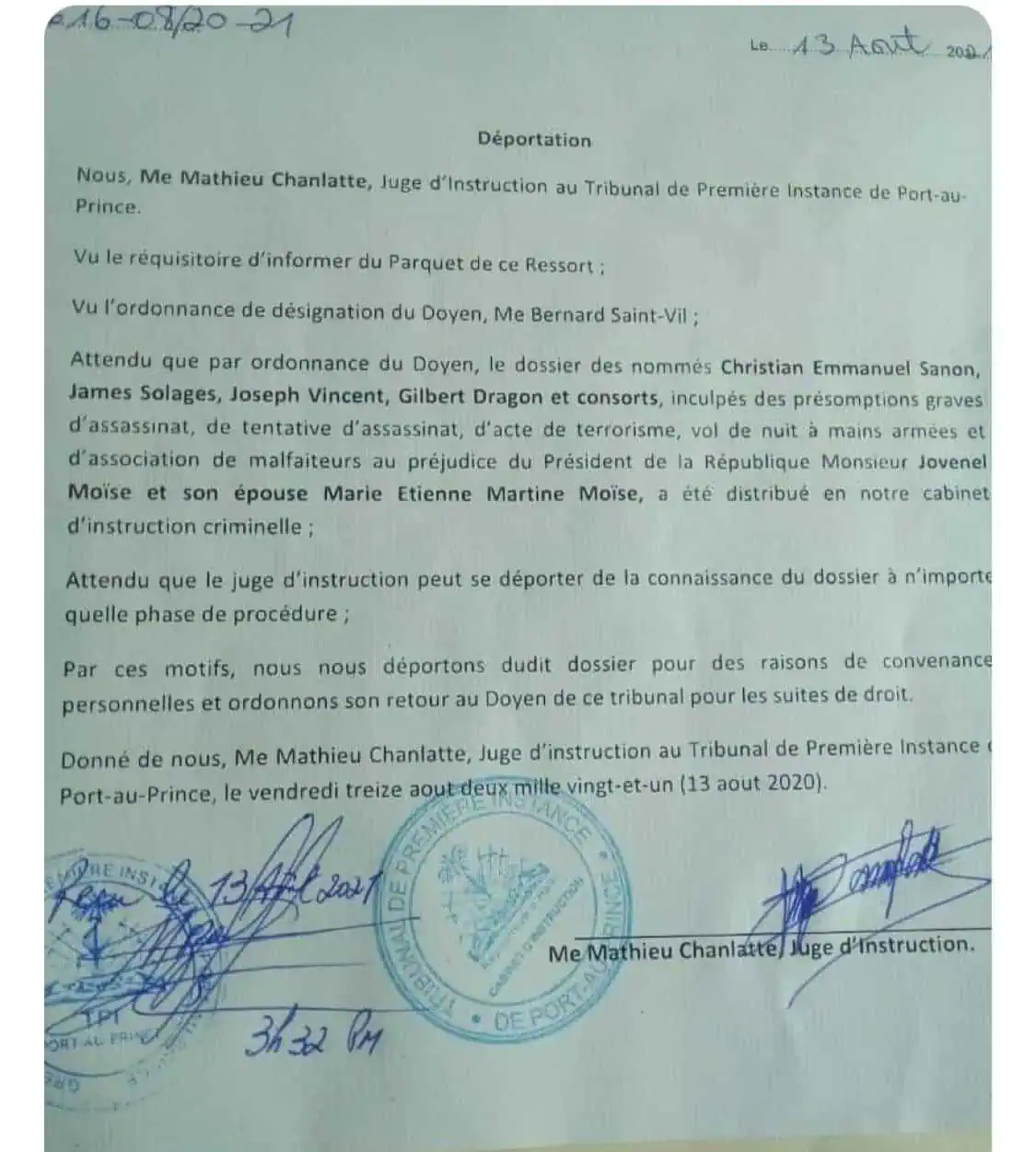 REDACCIÓN.- El juez recién designado para realizar las investigaciones sobre el asesinato del presidente Jovenel Moïse, Mathieu Chanlatte, informó este viernes que se retira del caso por "razones personales".