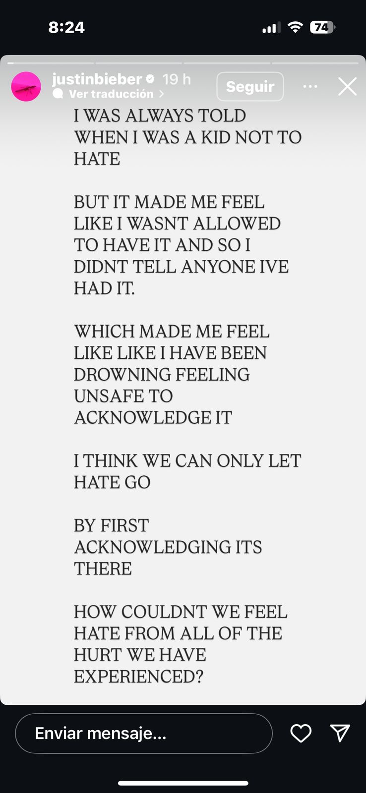 En el story de la red social, Justin Bieber compartió que desde niño le enseñaron a no odiar, pero que esta enseñanza lo llevó a reprimir ese sentimiento en lugar de procesarlo.