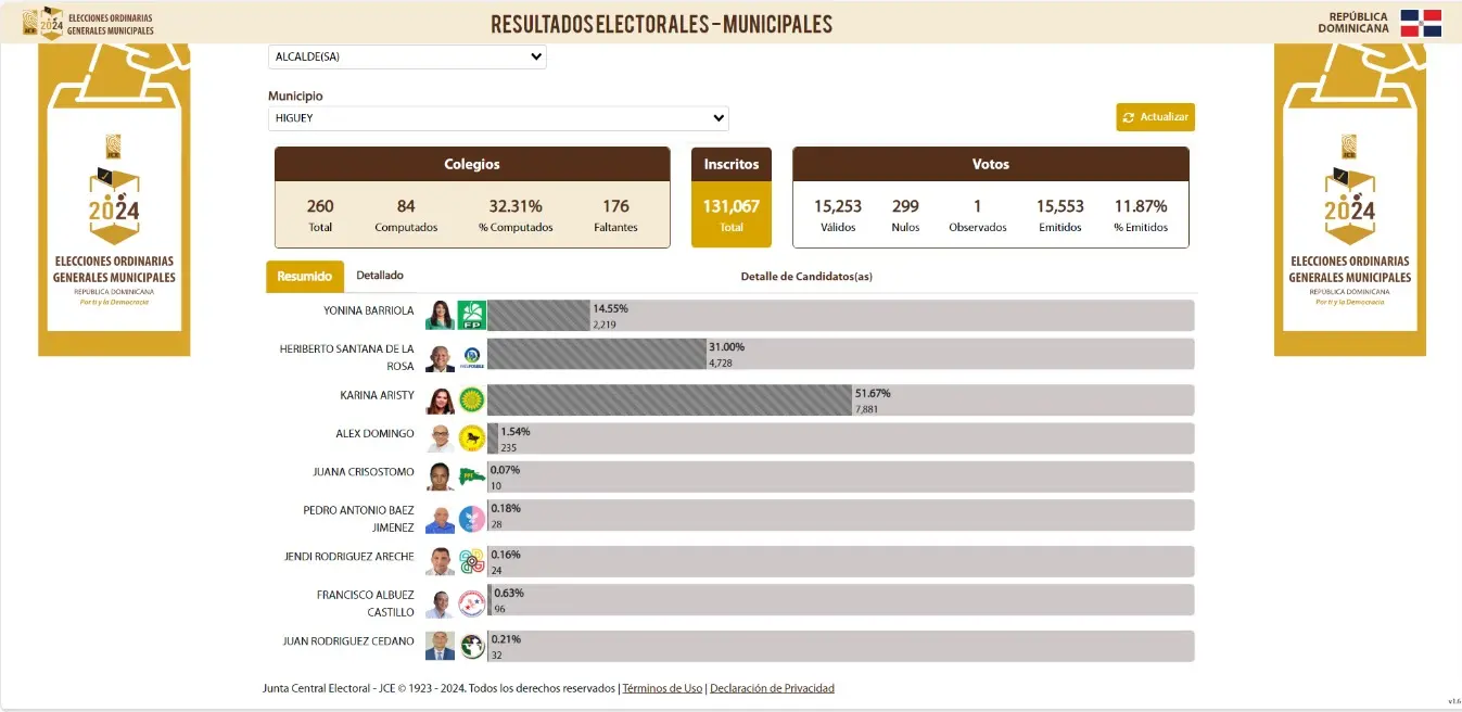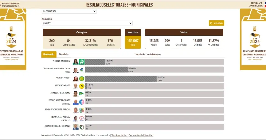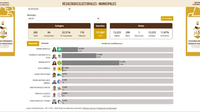 Santo Domingo. -Karina Aristy, la candidata del Partido Revolucionario Moderno (PRM) en Higüey lidera las elecciones municipales, con un 51.67% de acuerdo con el primer boletín emitido por la Junta Central Electoral (JCE), publicado a las 8:00 de la noche de este domingo 18 de febrero.