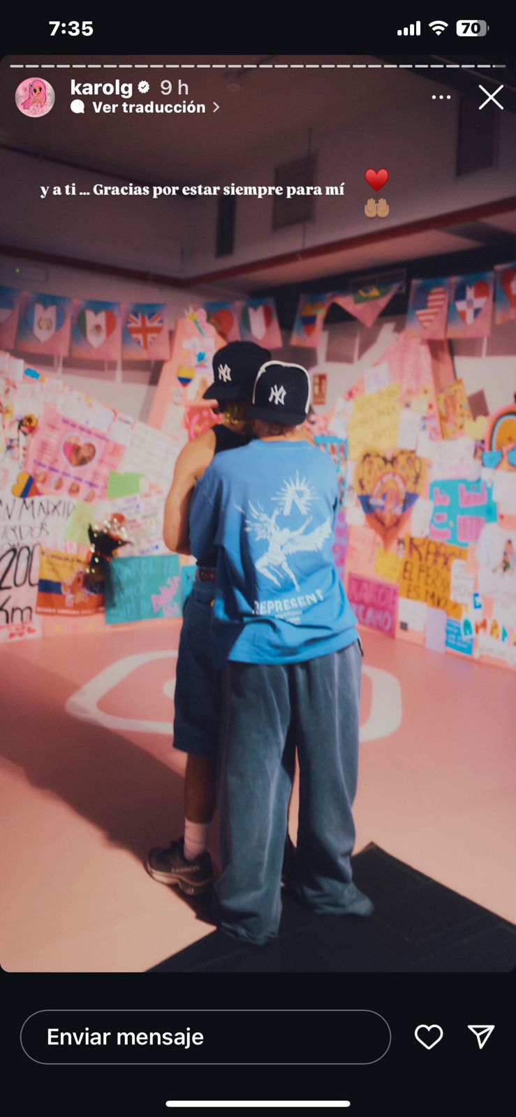 También, publicó fotos paseando por el museo en honor al “Mañana será bonito Tour” ubicado en Madrid. En la última imagen, se observa a Karol G abrazando a Feid con el siguiente mensaje: “Y a ti... gracias por estar siempre para mí”.