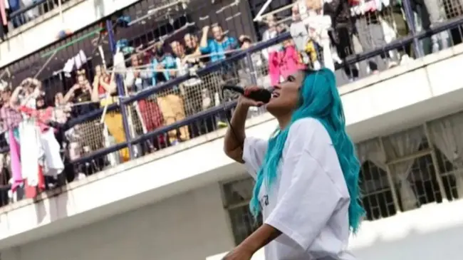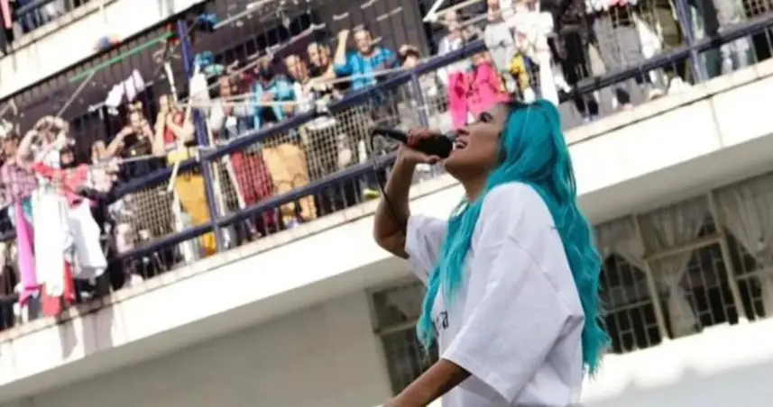 En videos publicados en las redes sociales, se ve a La Bichota cantar en un improvisado escenario instalado sobre una cancha de microfútbol junto a una guitarrista y una percusionista temas como 'Baby' o 'Amargura'.