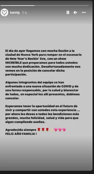 "El día de ayer llegamos con mucha ilusión a la ciudad de Nueva York para romper en el escenario de New Year' Rockin' Eve, con un show increíble que preparamos para todos ustedes con mucha dedicación. Desafortunadamente nos vemos en la posición de cancelar dicha participación".