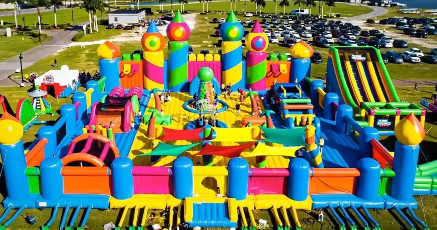 Las dimensiones del parque inflable se aproximan a la mitad de un campo de fútbol y la casa tardó una semana en montarse, dijo el gerente general Funbox, Aaron Cashin, quien destacó la ventaja de Florida, donde el "sol siempre brilla pase lo que pase".
