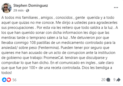 En una publicación, Domínguez aseguró que las acusaciones en contra de su persona son falsas y que el incidente está relacionado con la posesión de 108 pastillas de un medicamento controlado para tratar la ansiedad y el sobrepeso, específicamente Fentermina, recetadas bajo control médico.