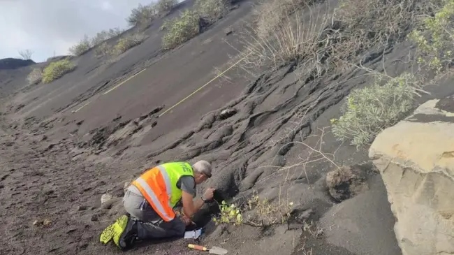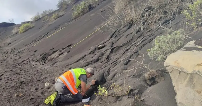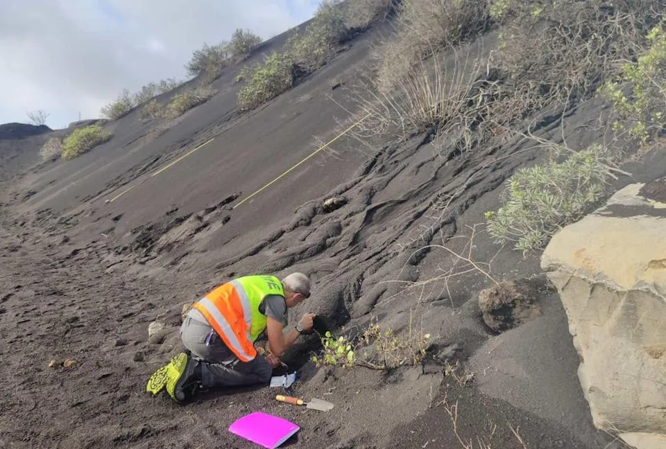 El primero de los factores que confluye es la cantidad de ceniza que se ha acumulado en una erupción "especialmente productiva", pues los investigadores del IGME han llegado a medir fuera del cono espesores de más de dos metros en algunas zonas.