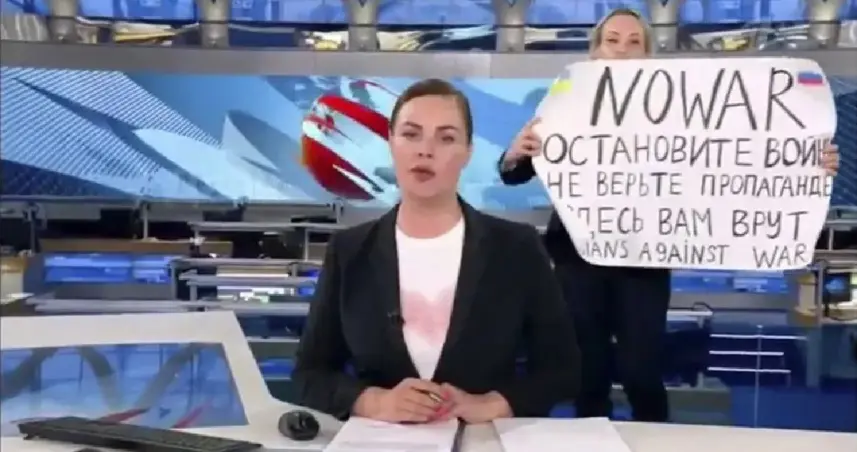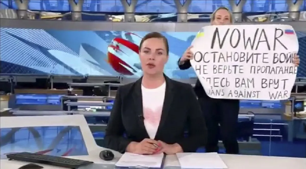 Ovsianikova, una periodista del Canal 1 de la televisión rusa, irrumpió ayer en la emisión en directo del noticiero nocturno Vremya gritando proclamas y blandiendo un cartel contra la guerra de Ucrania, tras lo cual fue detenida.