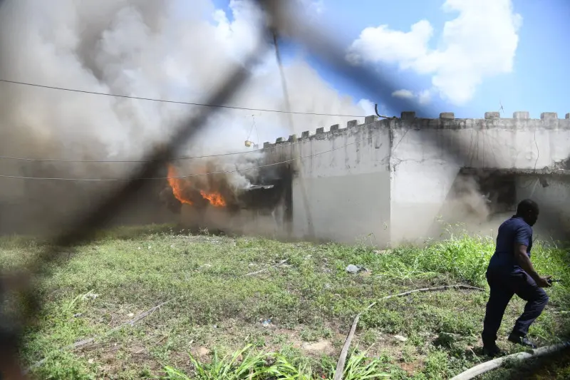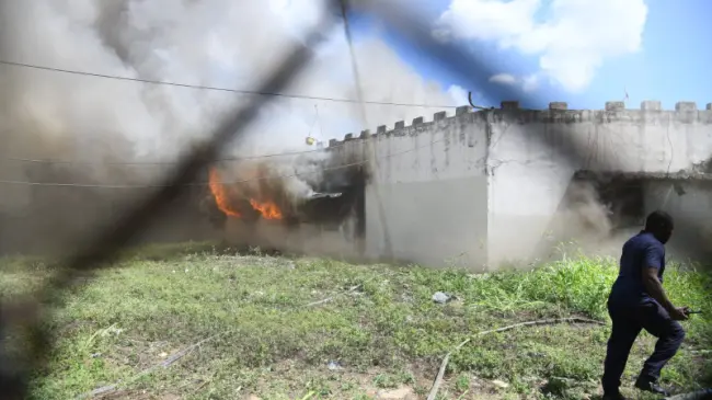 Aproximadamente 25 minutos después, unidades del cuerpo de bomberos intentaban sofocar las llamas que devoraban las instalaciones de la cafetería en el recinto carcelario.