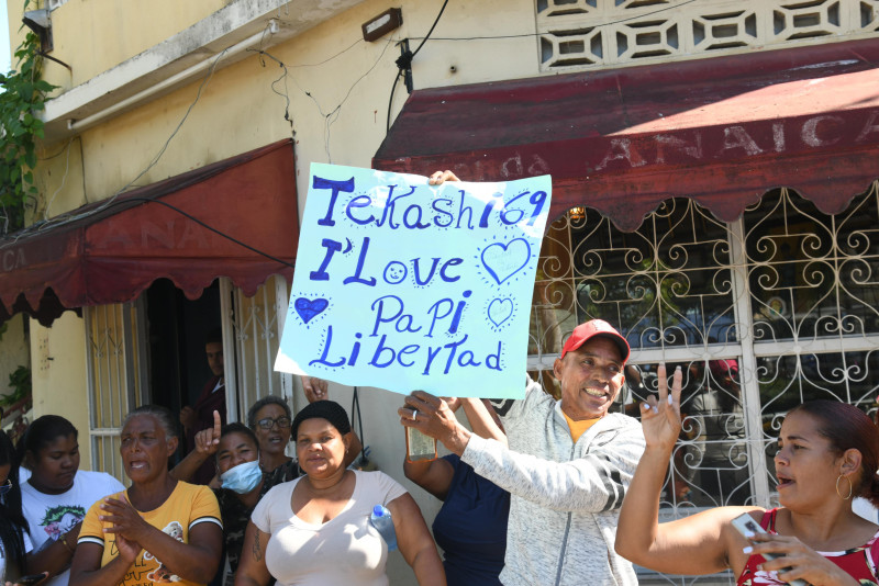 Como si se tratara de un espectáculo, en la calle García Godoy, donde se localiza el Destacamento de la Policía Nacional y el Palacio de Justicia, una cantidad considerable de personas se ha congregado masivamente para consumir bebidas alcohólicas, bailar y hasta lanzar fuegos artificiales en demostración de “apoyo” al rapero.