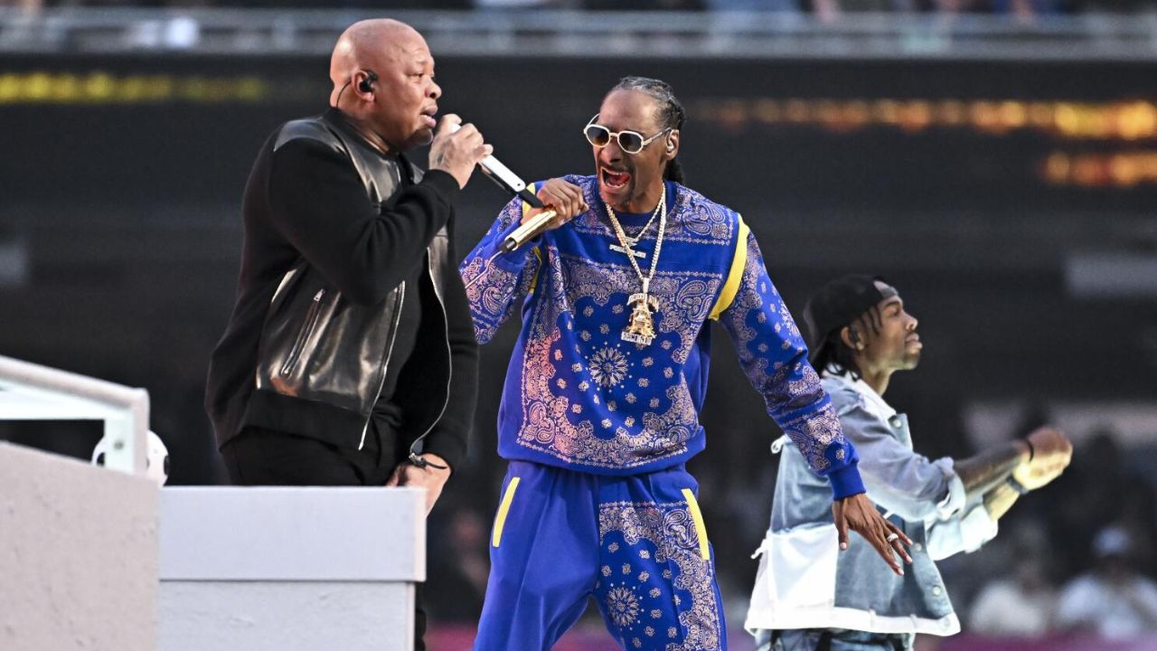 En esta alineación, en Los Ángeles, Dr. Dre dio inicio a la actuación sentado detrás de una mesa de mezclas totalmente blanca como homenaje a la cantidad de éxitos que ha producido. Tenía un escenario que era un mapa de la ciudad, repleto de coches antiguos y casas con habitaciones. Tenía a Anderson .Paak y a los miembros de la banda tocando al ritmo de las canciones. Tenía bailarines. Este es el mejor diseño de escenario en la historia del espectáculo de medio tiempo, sin lugar a dudas.