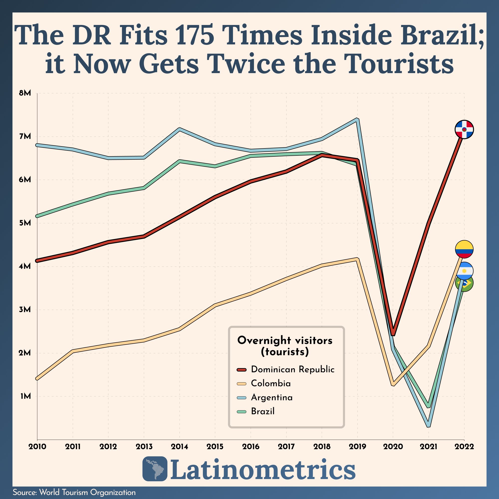Redacción.- Con su ubicación privilegiada en el Caribe y su proximidad a América del Norte, la República Dominicana recibió un récord de 7 millones de turistas en 2022, ¡equivalente a casi el 58% de su población!, según explica Latinometrics.