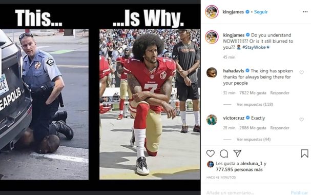 A la vez que hace un collage y monta otra imagen a la derecha del jugador de la NFL Colin Kaepernick arrodillado al momento de entonar el himno de los estados unidos buscando llamar la atención sobre la injusticia racial y encima le pone la descripción “ es por esto..” en el texto que acompaña esta grafica James dice lo siguiente:
