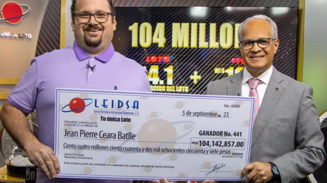 Santo Domingo.– SANTO DOMINGO.- El abogado Jean Pierre Ceará Batlle se convirtió en el millonario número 441 de la Lotería Electrónica Internacional Dominicana, S.A. (LEIDSA), al ganar un premio de RD$104,142,857.00.