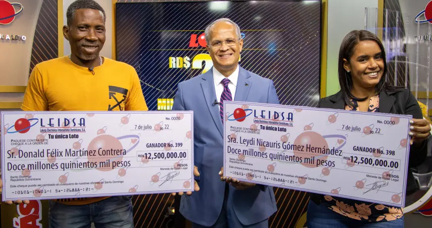 SANTO DOMINGO.- Leydi Nicauris Gómez Hernández y Donald Félix Martínez Contreras, recibieron cada uno 12.5 millones, la proporción que le corresponde por haber compartido el premio de 25 millones de pesos, monto que tenía el acumulado Loto en el sorteo del pasado sábado 18 de junio, donde ellos acertaron con los números: 03-12-13-17-21-25.