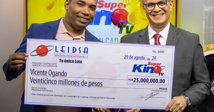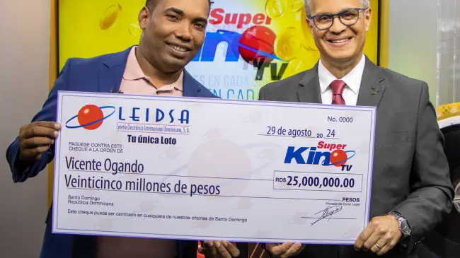 Santo Domingo.– SANTO DOMINGO.- La Lotería Electrónica Internacional Dominicana, S.A (LEIDSA), informó que Vicente Ogando recibió el cheque de 25 millones de pesos, ya que resultó ganador con el Súper Kino Tv, en el sorteo correspondiente al pasado jueves 8 de agosto.