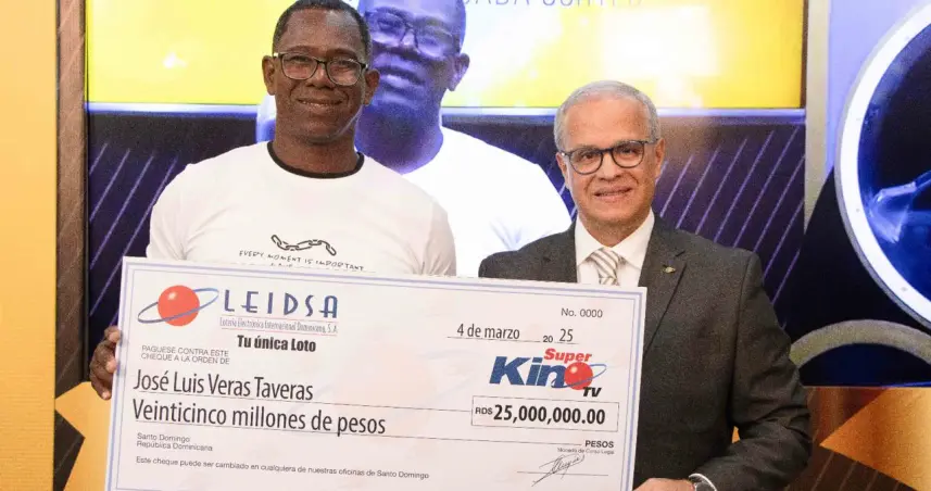 Santo Domingo.– SANTO DOMINGO. - La Lotería Electrónica Internacional Dominicana, S,A, (Leidsa), informó que el Sr. José Luís Veras Taveras, recibió el cheque de 25 millones de pesos, al resultar ganador con el Súper Kino Tv, en el sorteo correspondiente al pasado sábado 1ero de febrero.