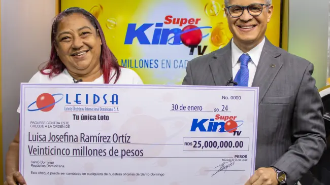 Santo Domingo.– SANTO DOMINGO.- La Lotería Electrónica Internacional Dominicana (Leidsa) informó que Luisa Josefina Ramírez Ortiz, recibió el cheque de RD$25 millones de pesos, por resultar ganadora con el Súper Kino Tv, en el sorteo correspondiente al pasado sábado 6 de enero.