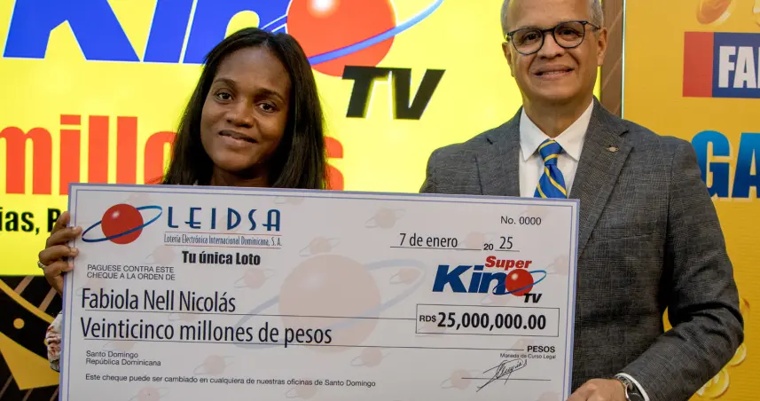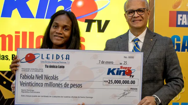 La Lotería Electrónica Internacional Dominicana (Leidsa) informó que la señora Fabiola Nell Nicolás, recibió el cheque de 25 millones de pesos, ya que resultó ganadora con el Súper Kino Tv, en el sorteo del pasado viernes 13 de diciembre.