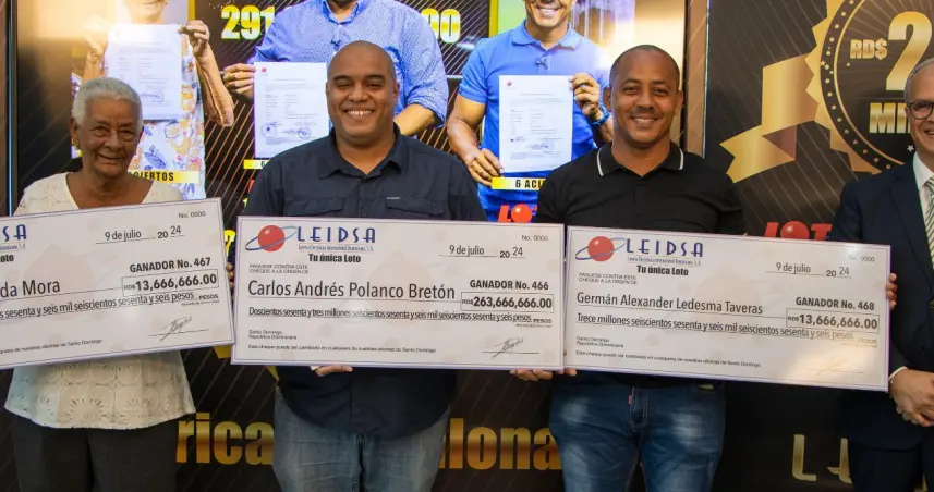 Santo Domingo.– SANTO DOMINGO.- La Lotería Electrónica Internacional Dominicana, S.A (LEIDSA), informó que entregó los cheques a los señores: Carlos Andrés Polanco Bretón, Carmen Zunilda Mora y a German Alexander Ledesma Taveras, quienes se dividieron los 291 millones de pesos, que tenía el sorteo del pasado sábado 15 de junio 2024.