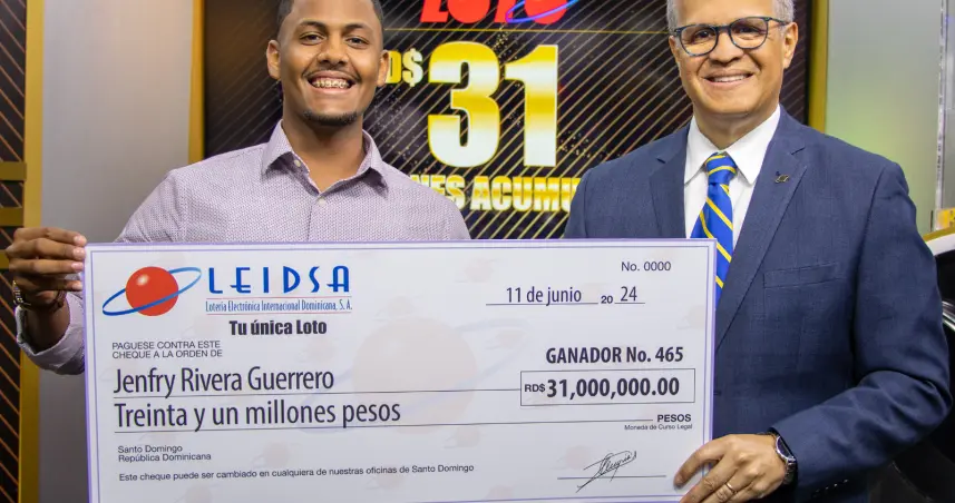 Santo Domingo.– Santo Domingo.- La Lotería Electrónica Internacional Dominicana (Leidsa) informó, que entregó al joven Jenfry Rivera Guerrero, el cheque de 31 millones de pesos, correspondiente al sorteo Loto del pasado miércoles 22 de mayo.