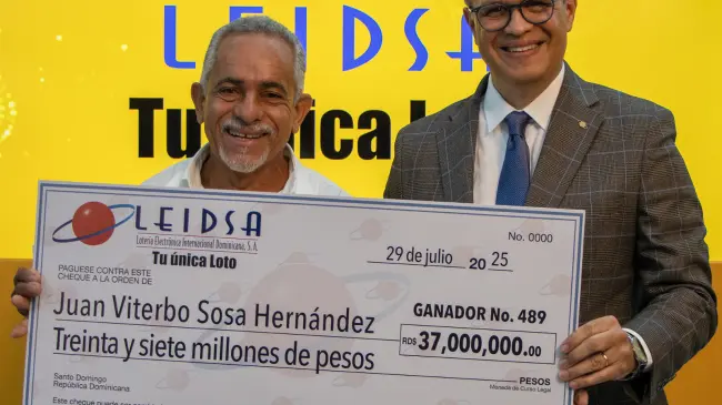 Santo Domingo.– SANTO DOMINGO.- La Lotería Electrónica Internacional Dominicana, S,A (Leidsa), informó que el Sr. Juan Viterbo Sosa Hernández recibió el cheque de 37 millones de pesos, al resultar ganador en el sorteo del pasado sábado 5 de julio.
