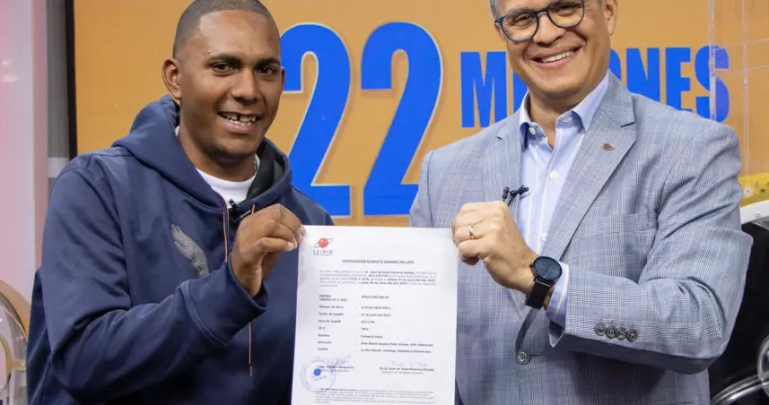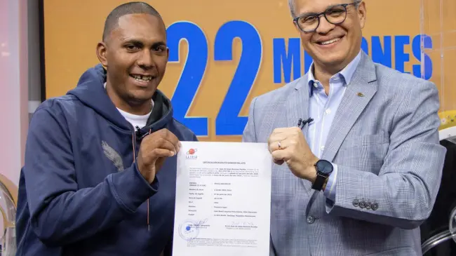 Santo Domingo.– SANTO DOMINGO.- La Lotería Electrónica Internacional Dominicana, S,A (LEIDSA), informó que el joven Juan de Jesús Ramírez Peralta, recibió el certificado que lo acredita como el ganador de los 22 millones de pesos que tenía el sorteo Loto correspondiente al pasado sábado 7 de junio.