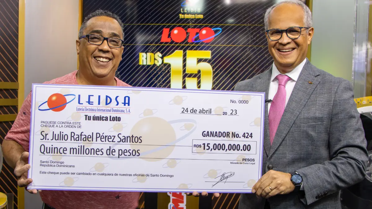 SANTO DOMINGO.- El señor Julio Rafael Pérez Santos recibió su premio de 15 millones de pesos correspondiente al sorteo de “Tu única Loto”, del pasado miércoles 29 de marzo del 2023.