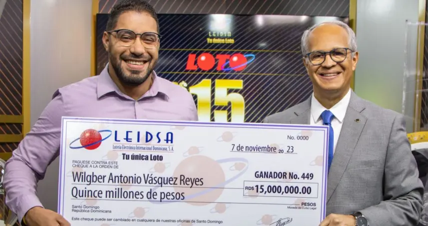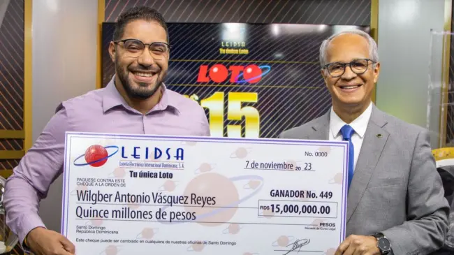 Santo Domingo.– SANTO DOMINGO.- La Lotería Electrónica Internacional Dominicana S.A. (Leidsa) informó que entregó el premio de RD$15 millones de pesos al joven Wilgber Ant. Vasquez Reyes, monto con los cuales iniciaba el sorteo Loto del pasado miércoles 11 de octubre del 2023.