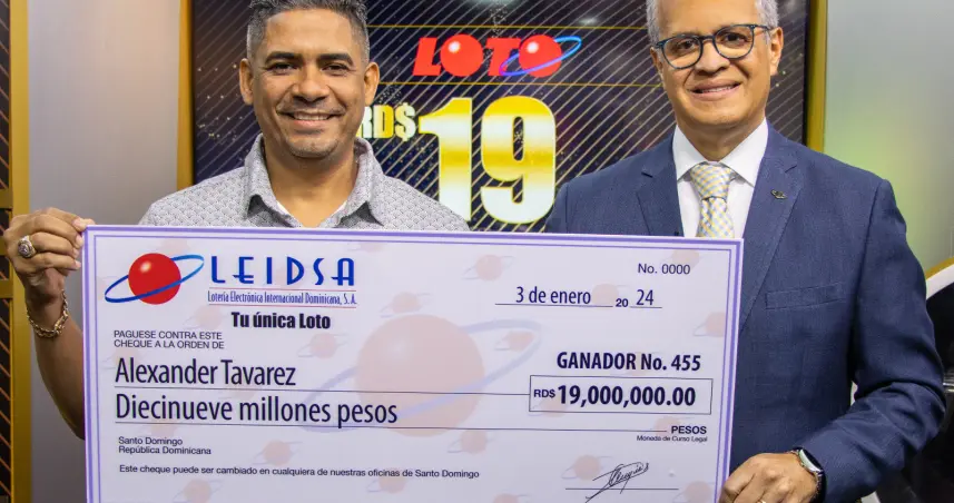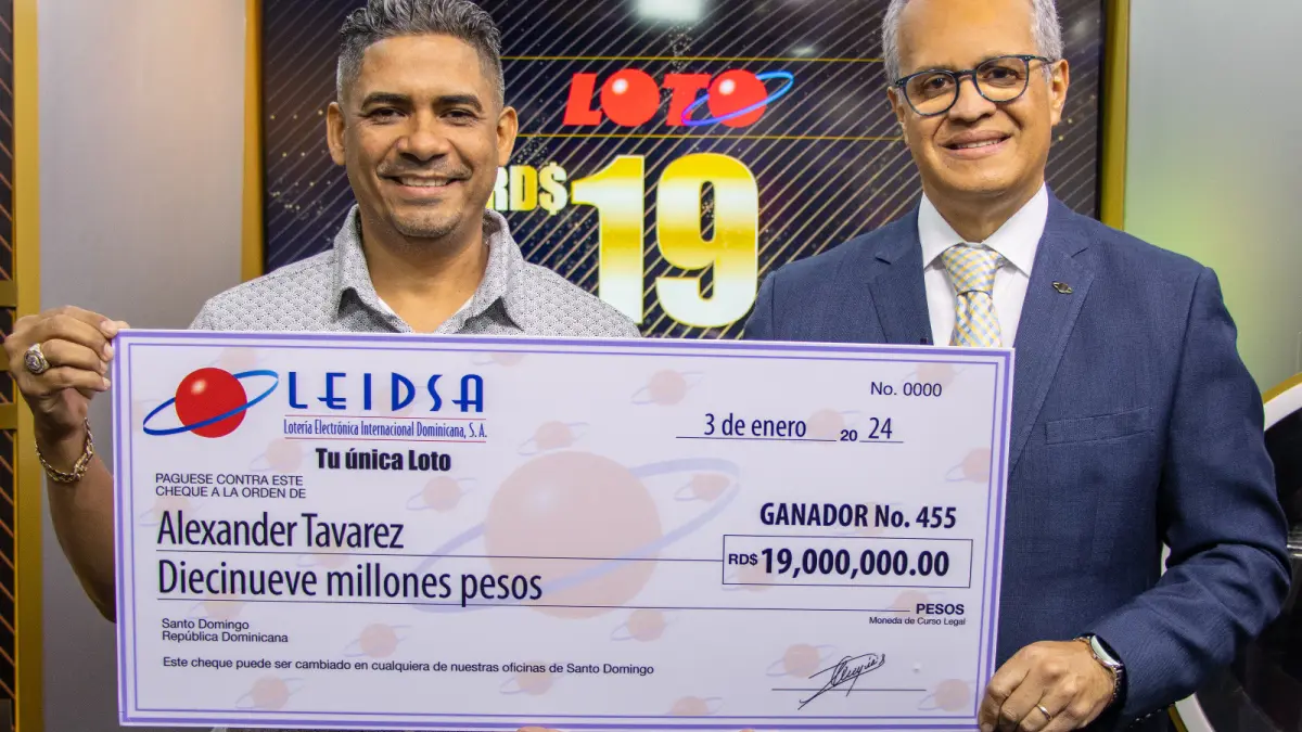 Santo Domingo.– SANTO DOMINGO.- La Lotería Electrónica Internacional Dominicana, S.A., informó que Alexander Tavarez, recibió el cheque de 19 millones de pesos, monto que tenía acumulado el sorteo Loto del pasado el sábado 9 de diciembre del 2023, al resultar ganador con los números: 5-23-29-32-33-37.