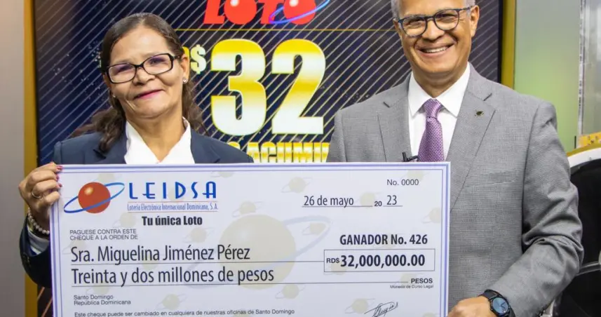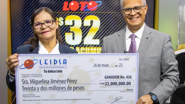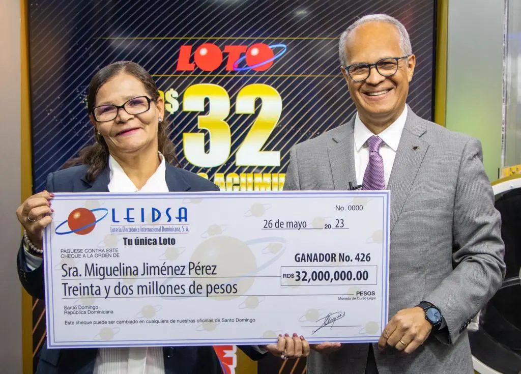Santo Domingo.– SANTO DOMINGO.- La Lotería Electrónica Internacional Dominicana (Leidsa), informó que la señora Miguelina Jiménez Pérez recibió su cheque de 32 millones de pesos, al resultar la ganadora en el sorteo de “Tu única Loto” del pasado miércoles 3 de mayo del 2023.