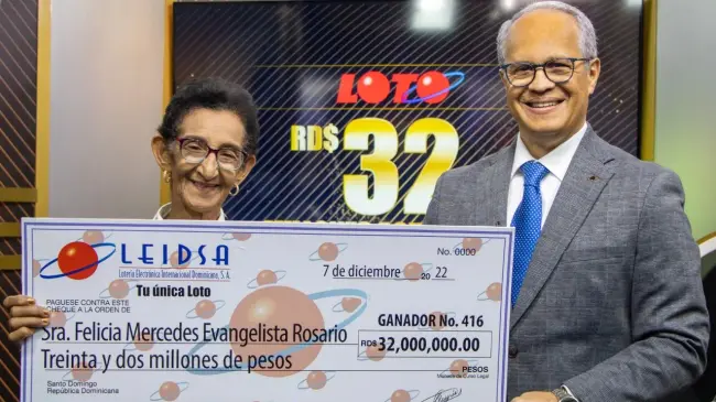 Santo Domingo.- La Lotería Electrónica Internacional Dominicana, S.A. (LEIDSA) entregó a la señora Felicia Mercedes Evangelista Rosario su premio de 32 millones de pesos, monto que tenía el sorteo Loto del pasado sábado 12 de noviembre del 2022.