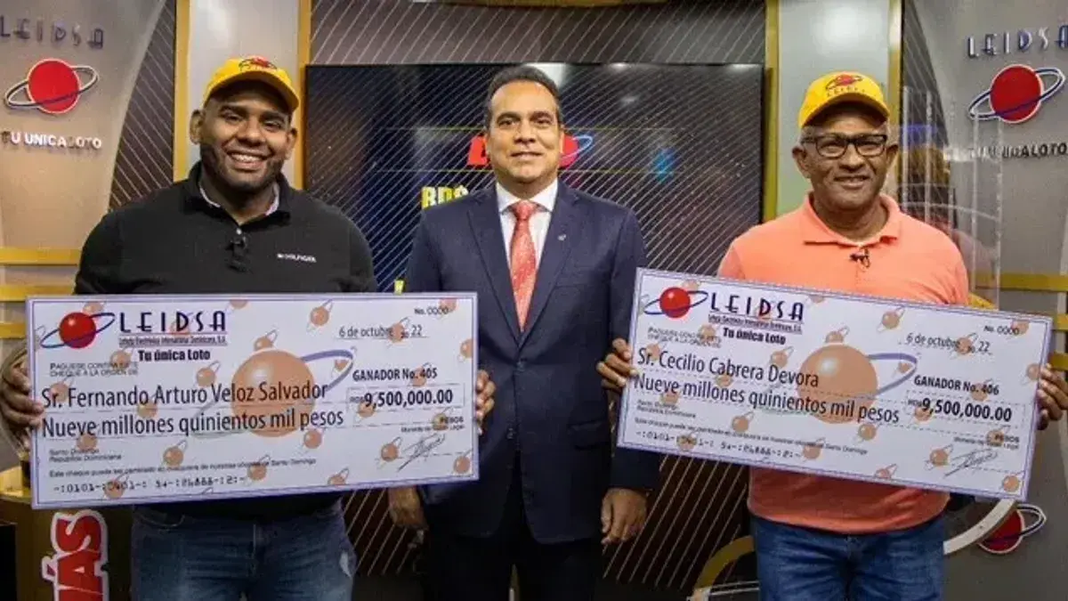 SANTO DOMINGO.- La Lotería Electrónica Internacional Dominicana, S.A. (LEIDSA), “Tu única Loto”, entregó los cheques a los dos ganadores que se dividieron 19 millones de pesos, monto que tenía acumulado el sorteo del Loto del pasado sábado 10 de septiembre 2022.