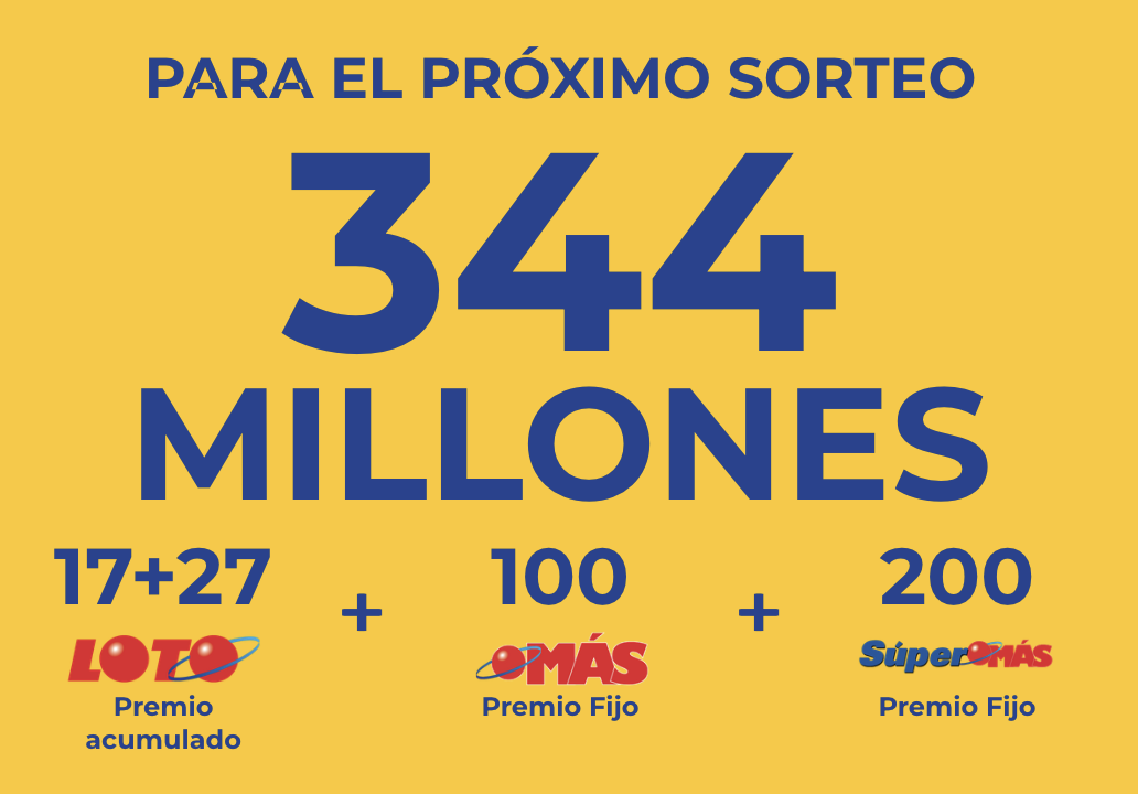 El monto para el sorteo de este sábado 23 será de, 344 millones de peso, compuesto por: 44 millones del Loto, (27mm no reclamos + 17 mm)+ 100 millones fijos del Más + los 200 fijos del Súper Más.