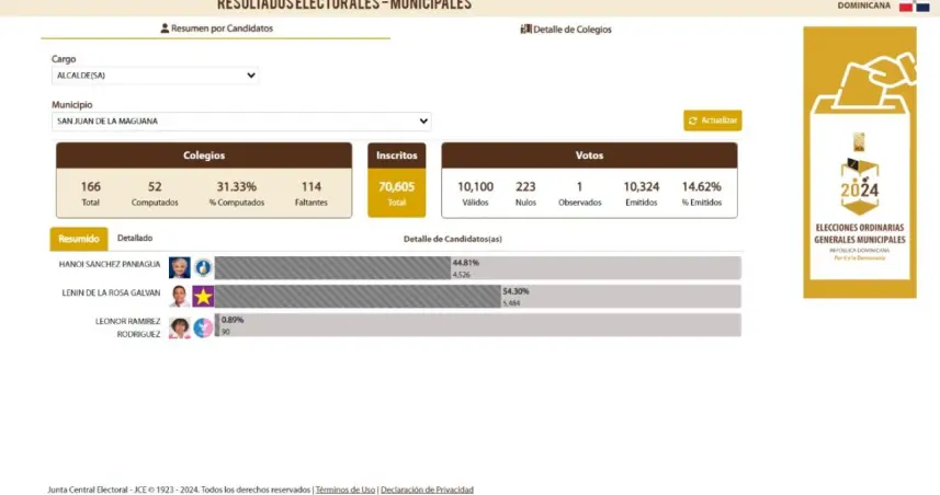 Santo Domingo.– Santo Domingo.- Los resultados del primer boletín de las elecciones ordinarias municipales, el candidato Lenin De La Rosa por el Partido Revolucionario Moderno, aspirante a la alcaldía en San Juan de la Maguana, lidera las votación con un 54.30% de los votos.