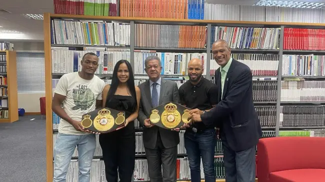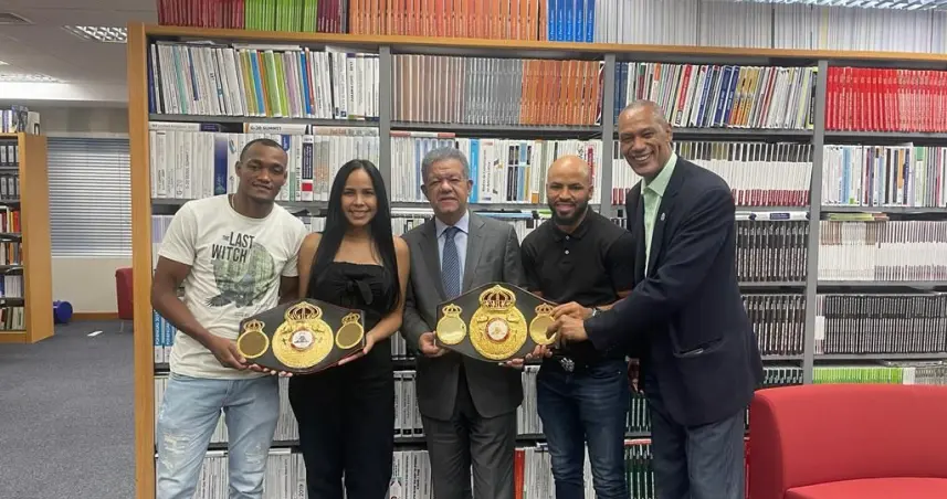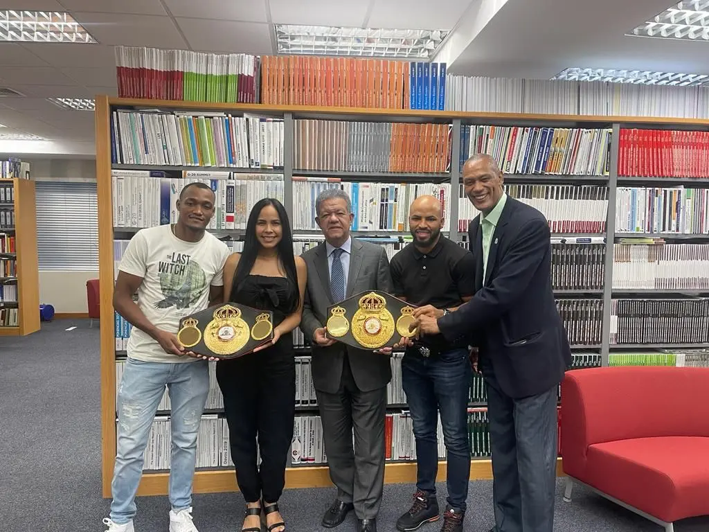 El doctor Fernández recibió en su biblioteca de la Fundación Global, Democracia y Desarrollo (FUNGLODE) a los brillantes boxeadores, en compañía de la promotora Bélgica Peña, de Shuan Boxing Promotion.