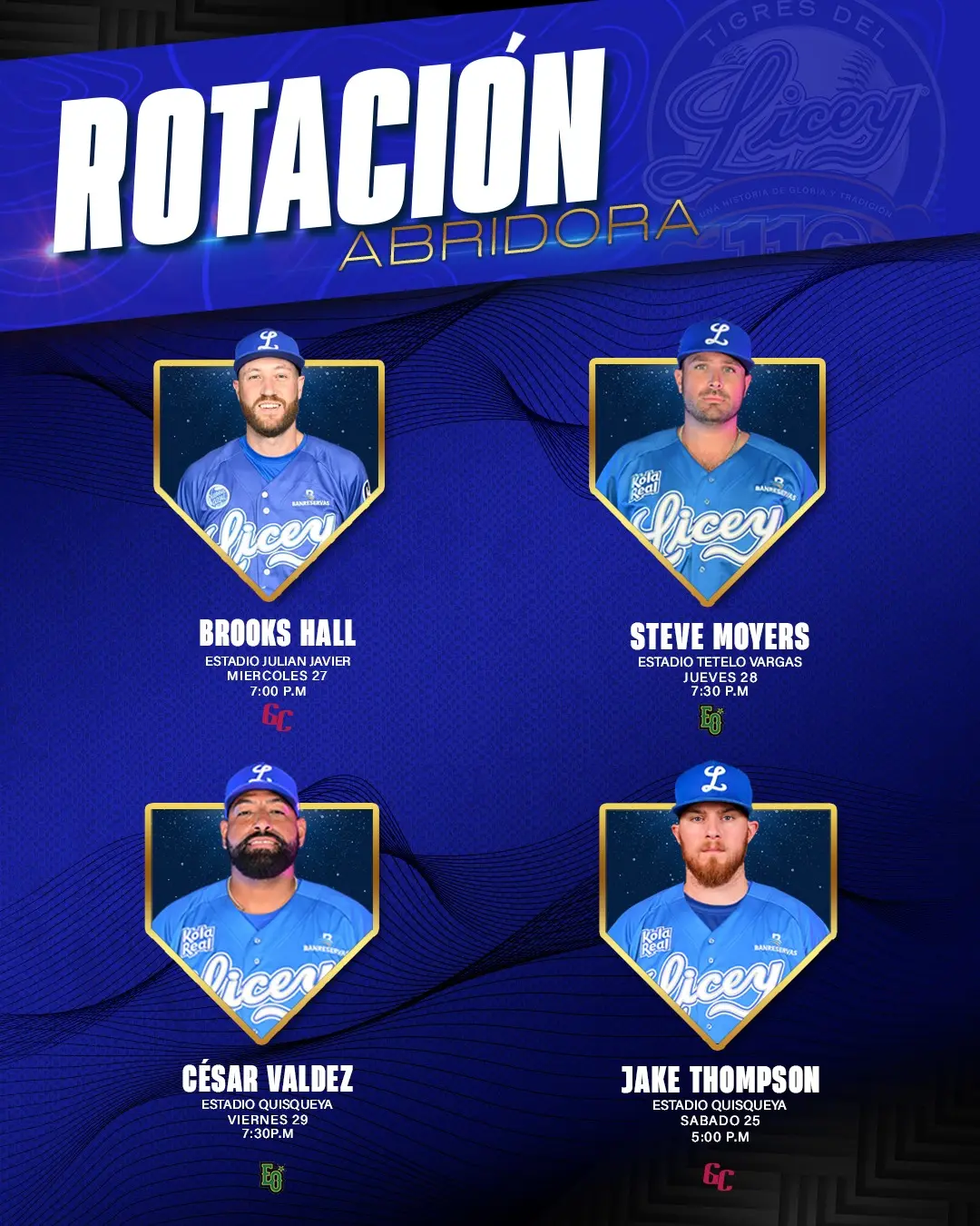 Santo Domingo.– Santo Domingo.- Los Campeones Nacionales y del Caribe, Tigres del Licey anunciaron su rotación para los primeros cuatro partidos del Round Robin de la Liga de Béisbol Profesional de la República Dominicana.